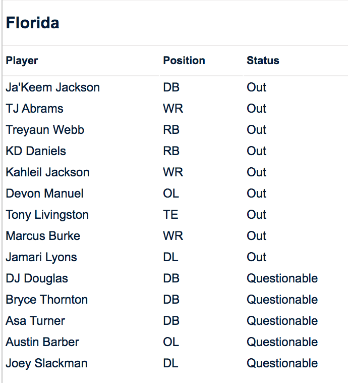 Florida’s injury report is very busy and while a few players have been hurt for most of the season and others do not have major roles, some are serious and worth noting.