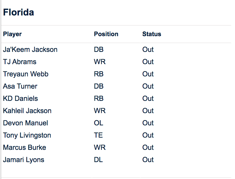 Starting left tackle Austin Barber is available for Florida. This is a big development because his backup Devon Manuel is out. Cornerback Bryce Thornton is also available after being questionable all week.
