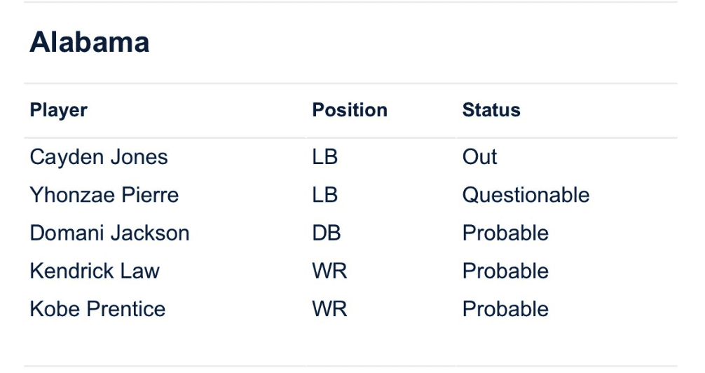 Domani Jackson is the biggest injury to watch here though he is still probable. He’s a starting safety for the Crimson Tide and has played in all six games while recording two interceptions. One of the best players in Alabama’s secondary.