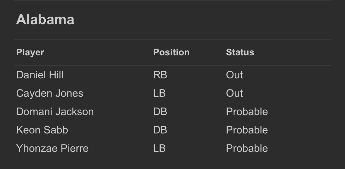 Unlike Tennessee, Alabama’s Thursday night injury report does feature a few big changes with key players.