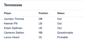 Seldon stayed at the “questionable” spot from Wednesday’s injury report as the second-year running back has been on and off Tennessee’s active lineup throughout the season. Seldon was projected to compete for the Vols’ backup running back position but that has primarily gone to running back DeSean Bishop in the wake of Seldon’s injuries.