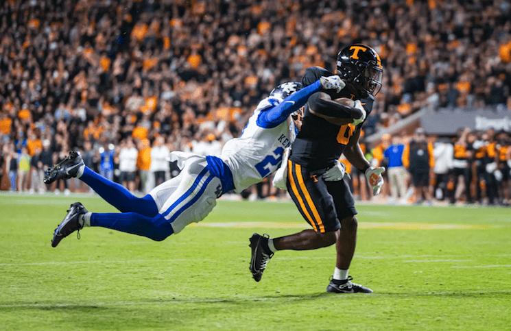 Dylan Sampson wrote his name in the Tennessee football record books on Saturday night, scoring two touchdowns against Kentucky to become the Vols’ single-season rushing