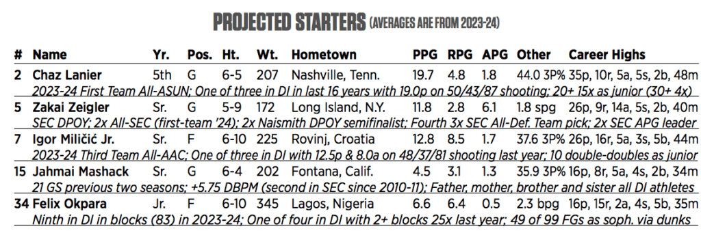 Assists: Zakai Zeigler — 8 APG, 7.5 TOPG, 33.5 MPG
