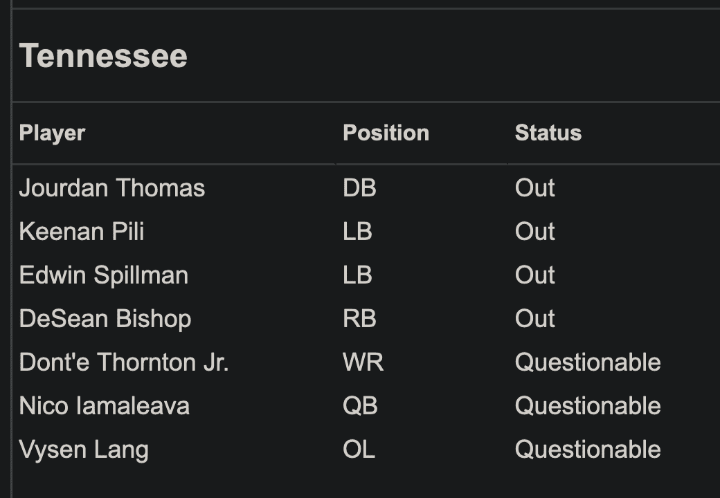 In the debut injury report on Wednesday night, Tennessee had three players listed as questionable and four listed as out. There are no changes on the Tennessee side in the Thursday night injury report.