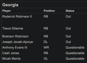 The big note here is that Georgia’s starting running back Trevor Etienne is out for the game after starting the week at questionable. Etienne is Georgia’s leading rusher on the season with 477 yards and seven touchdowns on 95 carries. The next-highest running back, Nate Frazier, has 333 yards on 72 carries this season. Etienne did play in Georgia’s loss last week to Ole Miss where he recorded 24 yards on six carries in limited action.