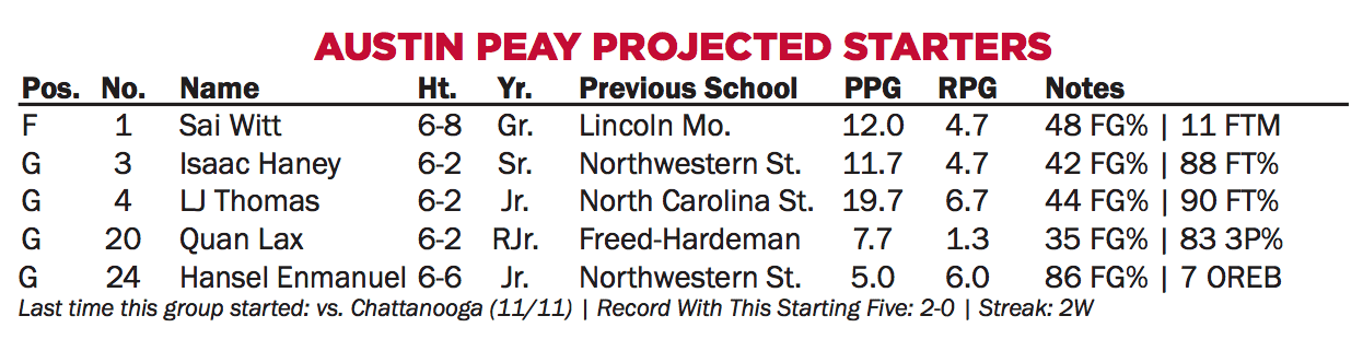 The Vols are coming off a midweek win over Montana and are looking to take care of business in their final tuneup before the Baha Mar Tournament next week. Austin Peay is also unbeaten and has already upset Butler earlier this season.