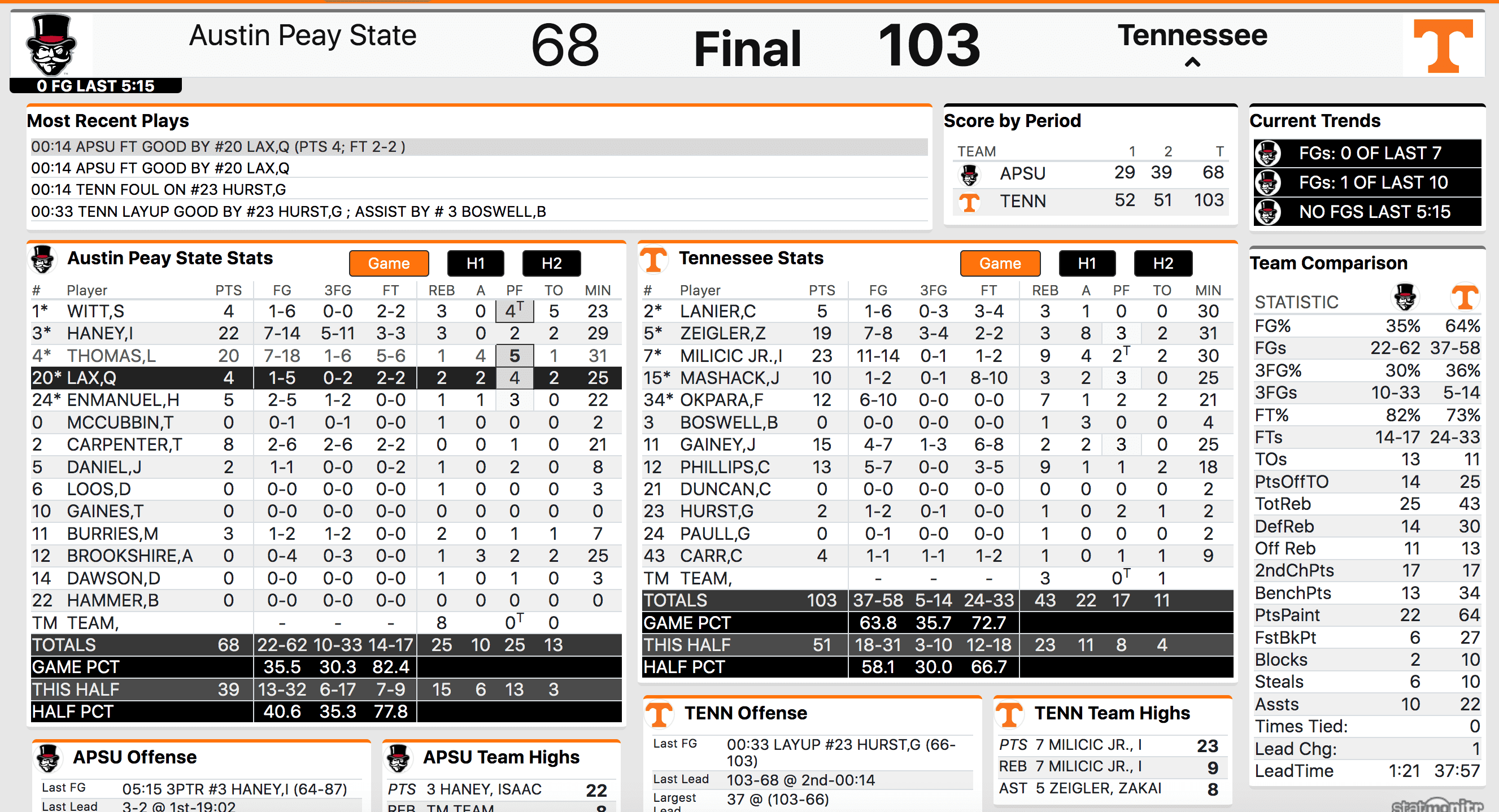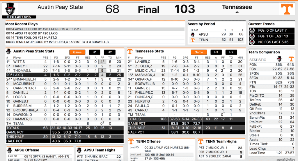 The Vols cruised to a 52-29 halftime lead and shot 70% from the field in the first half. Tennessee took control of the game, played relatively sharp and put to bed any thoughts that Austin Peay could pull off its second upset of the should season.