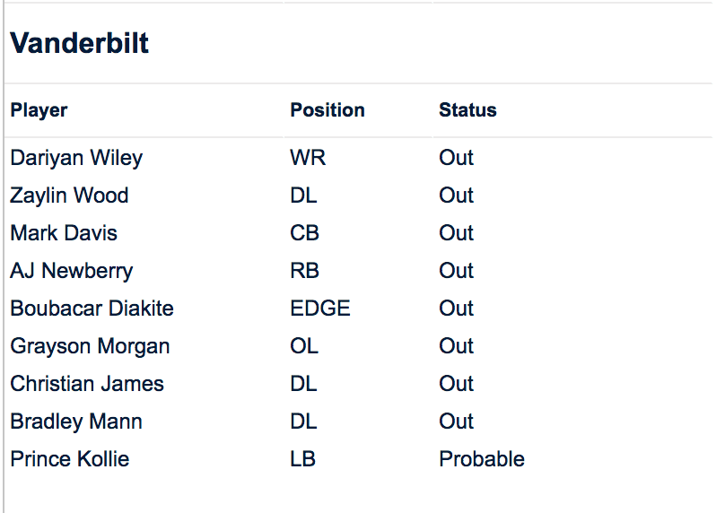 Two changes for Vanderbilt on its Friday night injury report. Defensive lineman Christian James has been officially ruled out while linebacker Prince Kollie has been upgraded from questionable to probable.