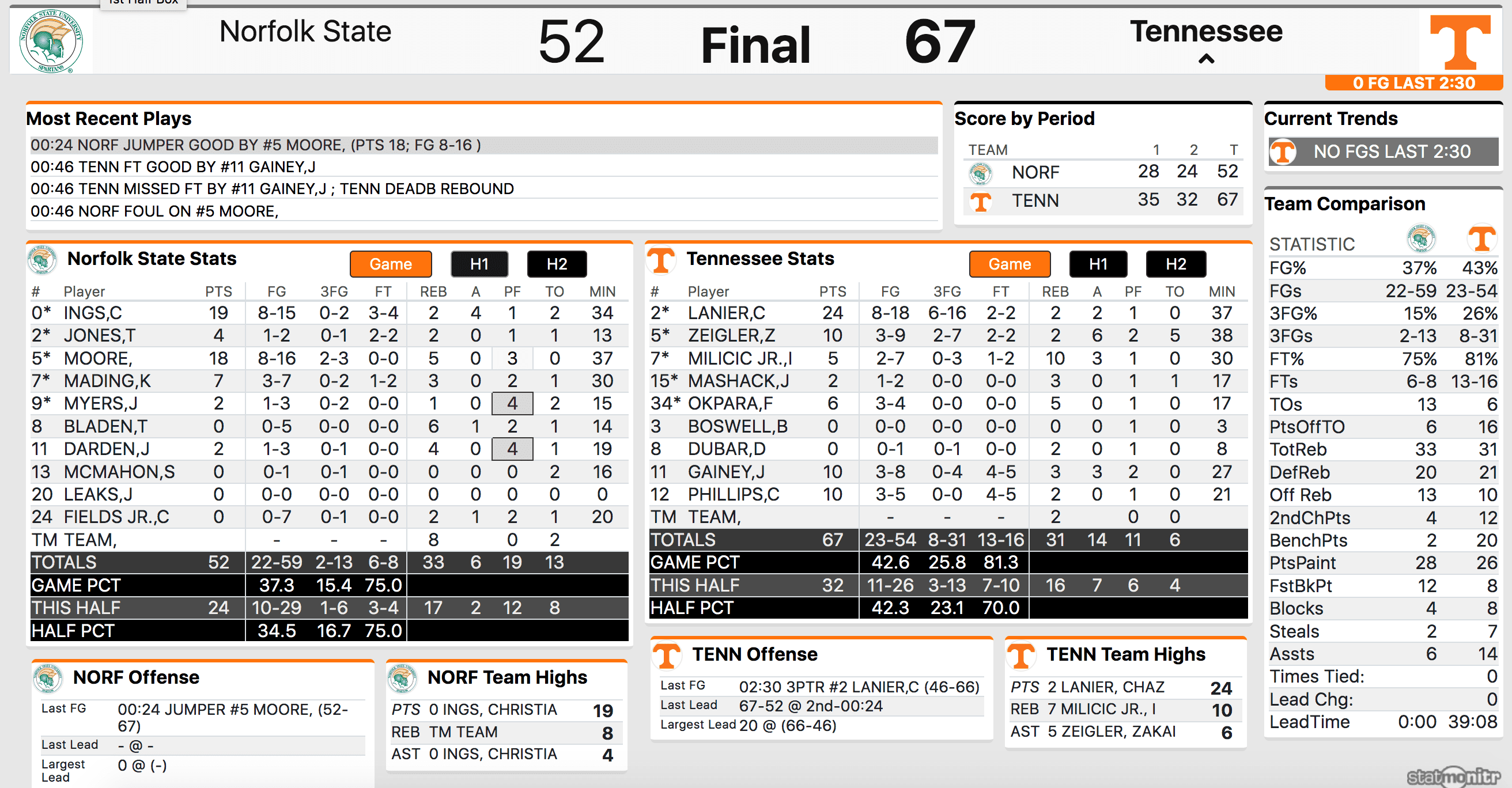 Tennessee just slowly and surely expanded its lead in the second half against Norfolk State. They got it to double digits the first possession of the second half, to 14 points with 14 minutes remaining and a game-high 20 points with just under three points remaining before finishing at 15 points after a late Norfolk State run.