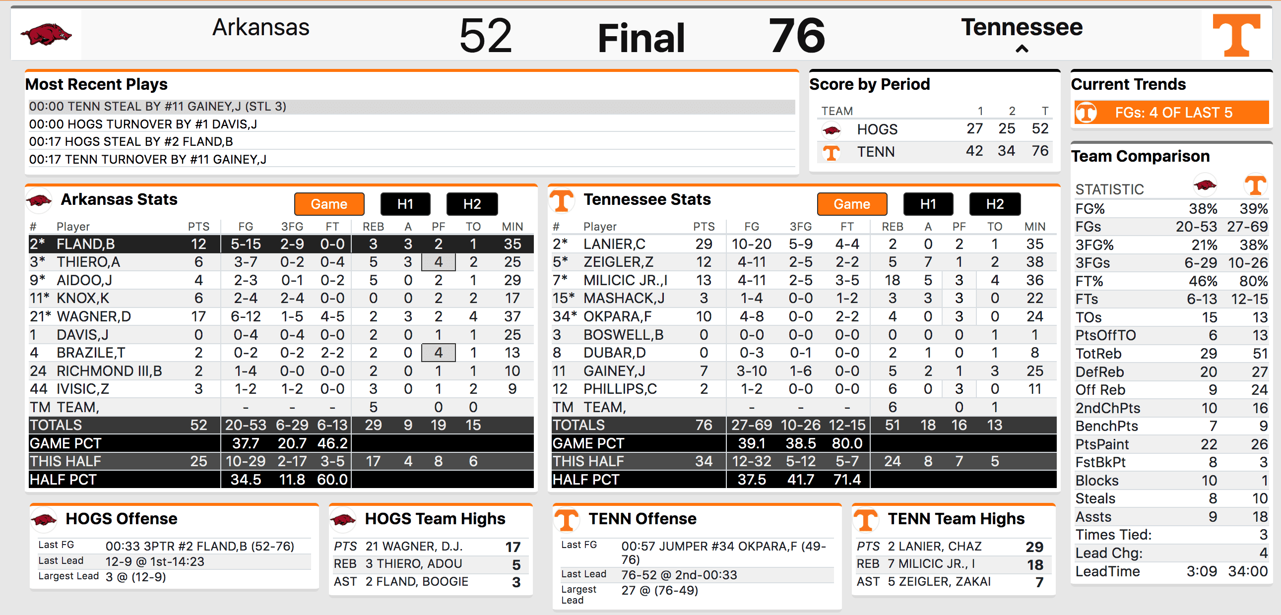 Lanier was Lanier, hitting shots from all over the floor. He made his first four shots from the field during a stretch where Tennessee pushed its lead to double-digits midway through the first half. The North Florida transfer led the game in scoring with 29 points.