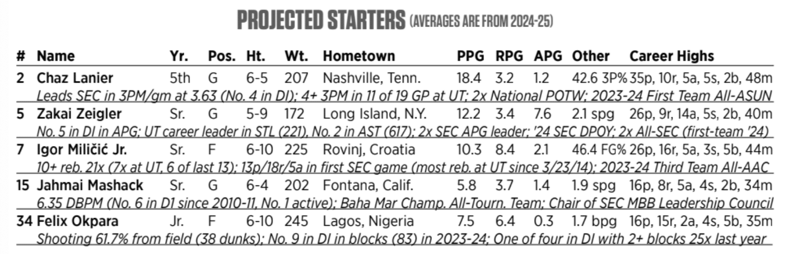 “He’s one of the leading assist guys in the country and he’s a brilliant passer. He’s already set the all-time record for Tennessee in steals, and he’s been the face of that program for a long, long time. In many ways, they go as he goes and he always goes pretty well. He’s a great three-point shooter with a great percentage and he’s hard to stay in front of. So obviously, so much of what you have to do, you got to gameplan for Zakai Zeigler. He will go down as one of the all-time greats in the history of Tennessee basketball.”