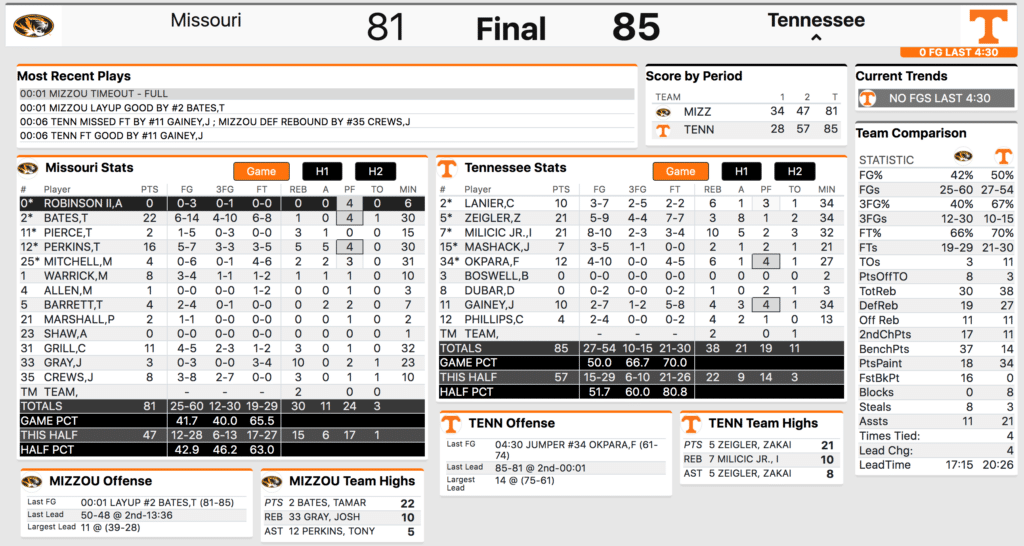 Tennessee turned it over on its next three trips down the court and while Missouri failed to score before the first media timeout, the Vols did little to capitalize on it. Tennessee led 5-0 at the first media timeout and the strong shooting Tigers made them pay for it.