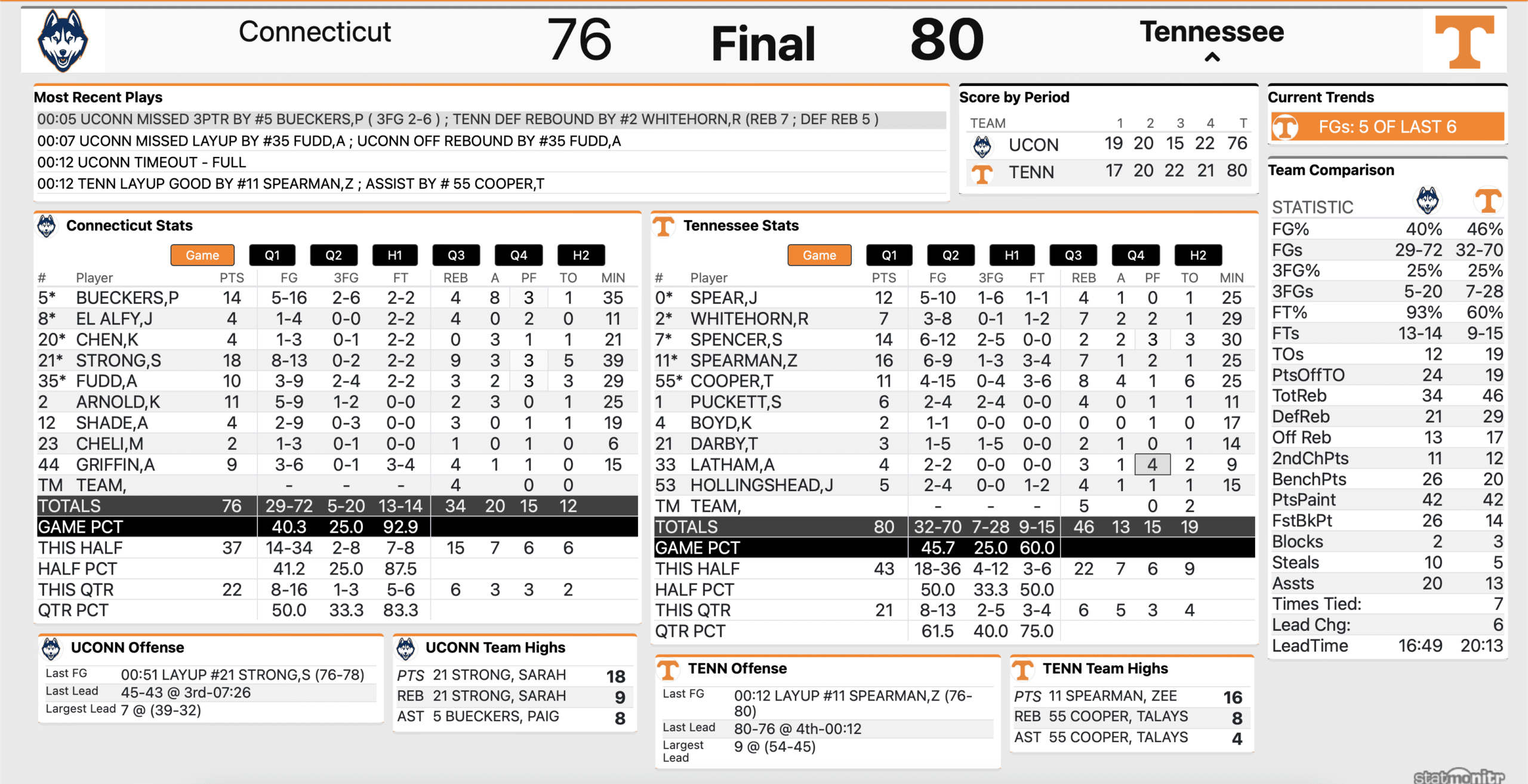 Tennessee moves to 17-5 with the 80-76 win over No. 5 UConn on Thursday night in the Food City Center.