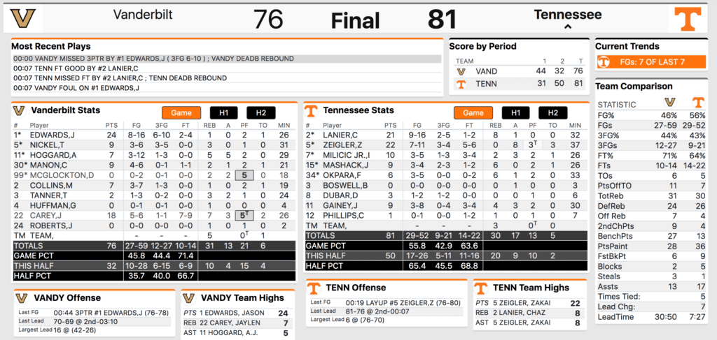 After Vanderbilt outscored Tennessee 44-31 in the first half, the Vols outscored Vanderbilt 26-11 in the first 11:15 of the second half to take their first lead of the game. That put the game on even footing for a well balanced final home stretch of the game.