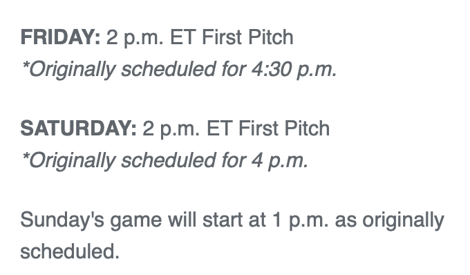 First pitch for Saturday’s game is now at 2 p.m. ET.
