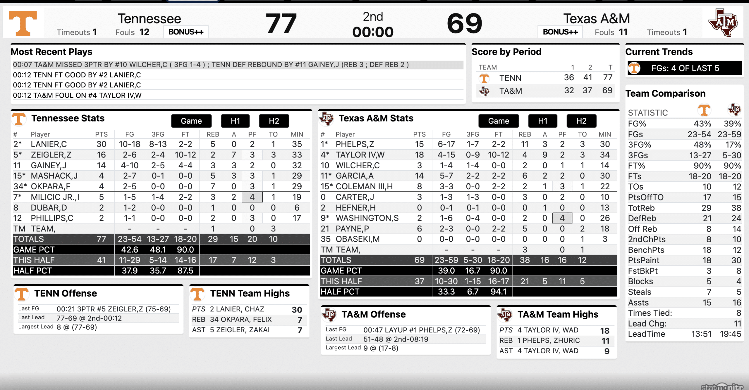 Tennessee did a good job of limiting Texas A&M in both of those areas. Wade Taylor dished out nine assists but struggled to score, totaling 18 points on a putrid zero-of-nine three-point shooting.