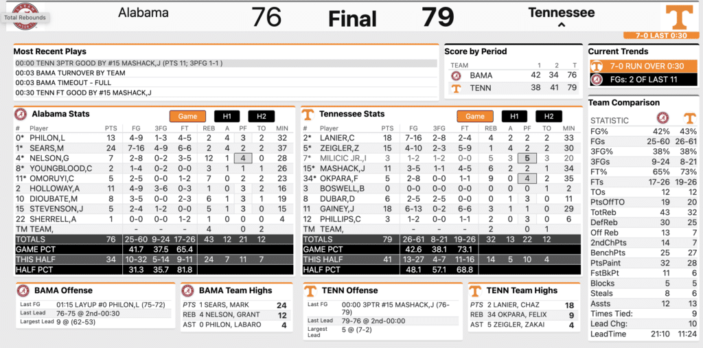 Fortunately for Tennessee, Lanier’s second foul was late in the half and not overly costly. Lanier, Dubar and Gainey were all good for the Vols in the first half as they kept Tennessee within four points at the break.