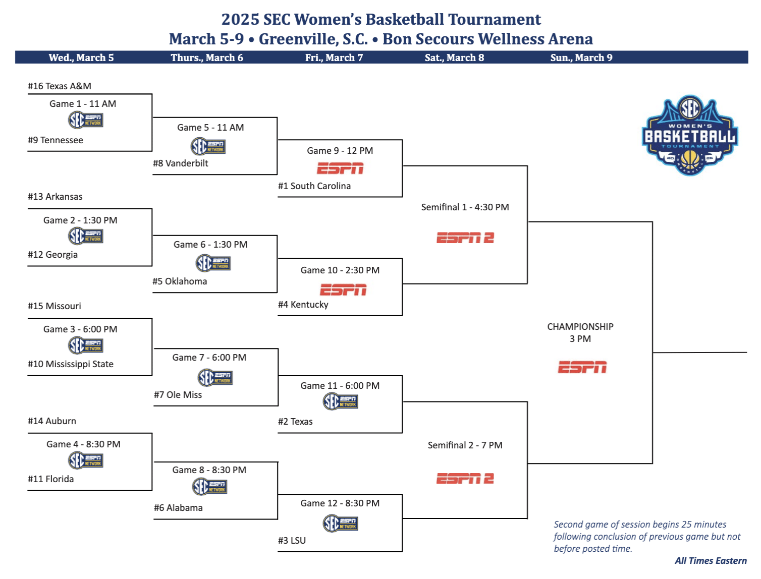 - Saturday Afternoon*: vs 4-seed Kentucky OR 5-seed Oklahoma OR 12-seed Georgia OR 13-seed Arkansas