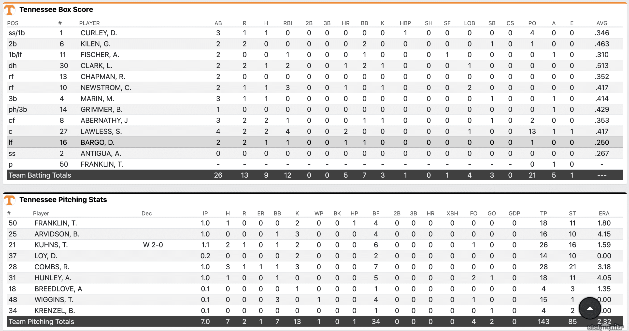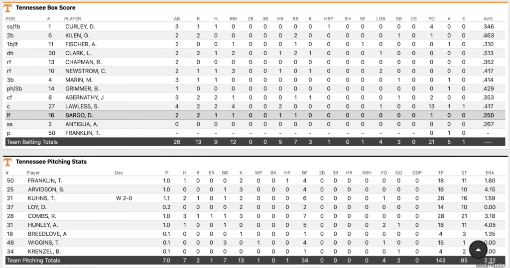 Those four runs were good enough for a strong inning either way. But Tennessee wasn’t done. The Vols scored three more all with two outs. Manny Marin reached on an infield single, stole second and scored Jay Abernathy drove home a run with a single to center field and then Stone Lawless annihilated a two-run homer 400 feet to left-center field.