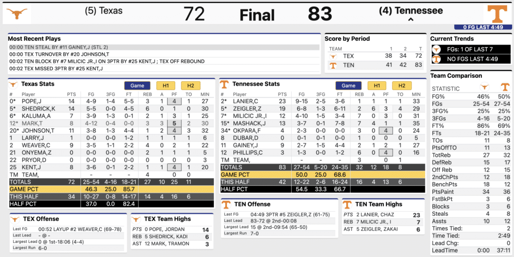 But that was not the case for the Longhorns, especially in the first half. Despite playing well on the offensive end, Tennessee was unable to create any separation in the first half due to Texas’ strong offense. The Longhorns totaled 38 first half points and did it on a strong 56% shooting from the field and four-of-eight shooting from three-point range.