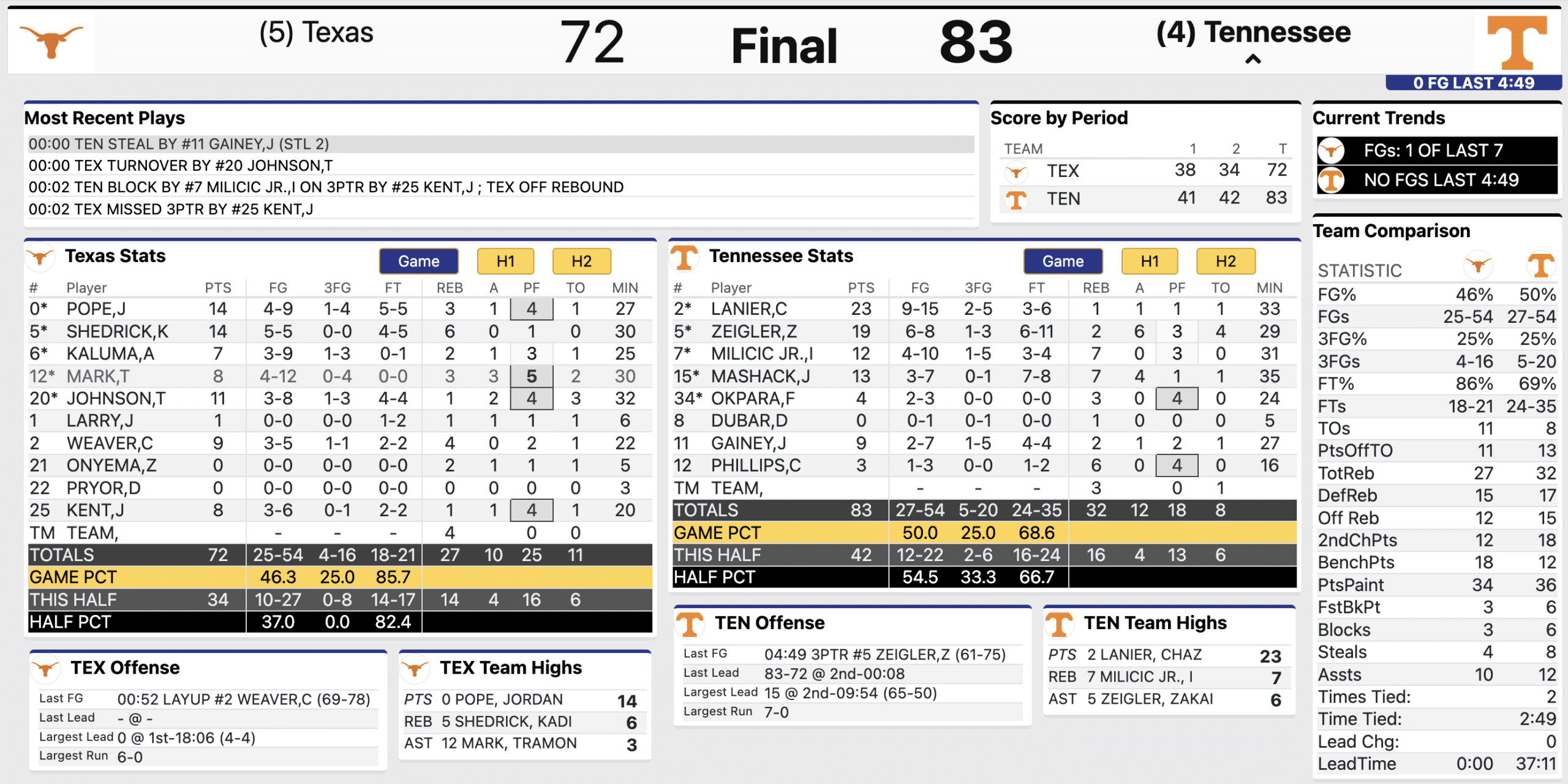 Lanier made baskets at the 18:20, 15:58, 15:25, 13:07 and 11:14 marks in the first half. By the time the run ended, Lanier had scored 17 of Tennessee’s first 21 points as the Vols built a seven-point lead in the game’s first nine minutes. He did it on an incredibly efficient seven-of-nine shooting from the field.
