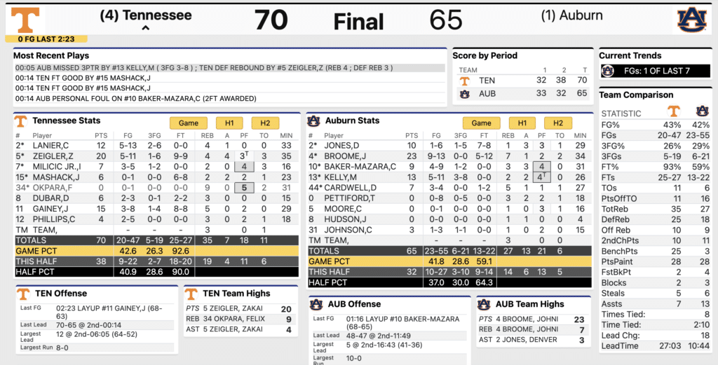 But from there, the game’s pace and shot making went down as both teams defensive intensity picked up along with the game’s physicality. In the final 10 minutes of the first half, Auburn outscored Tennessee 16-10 to take a one-point lead into the halftime break.
