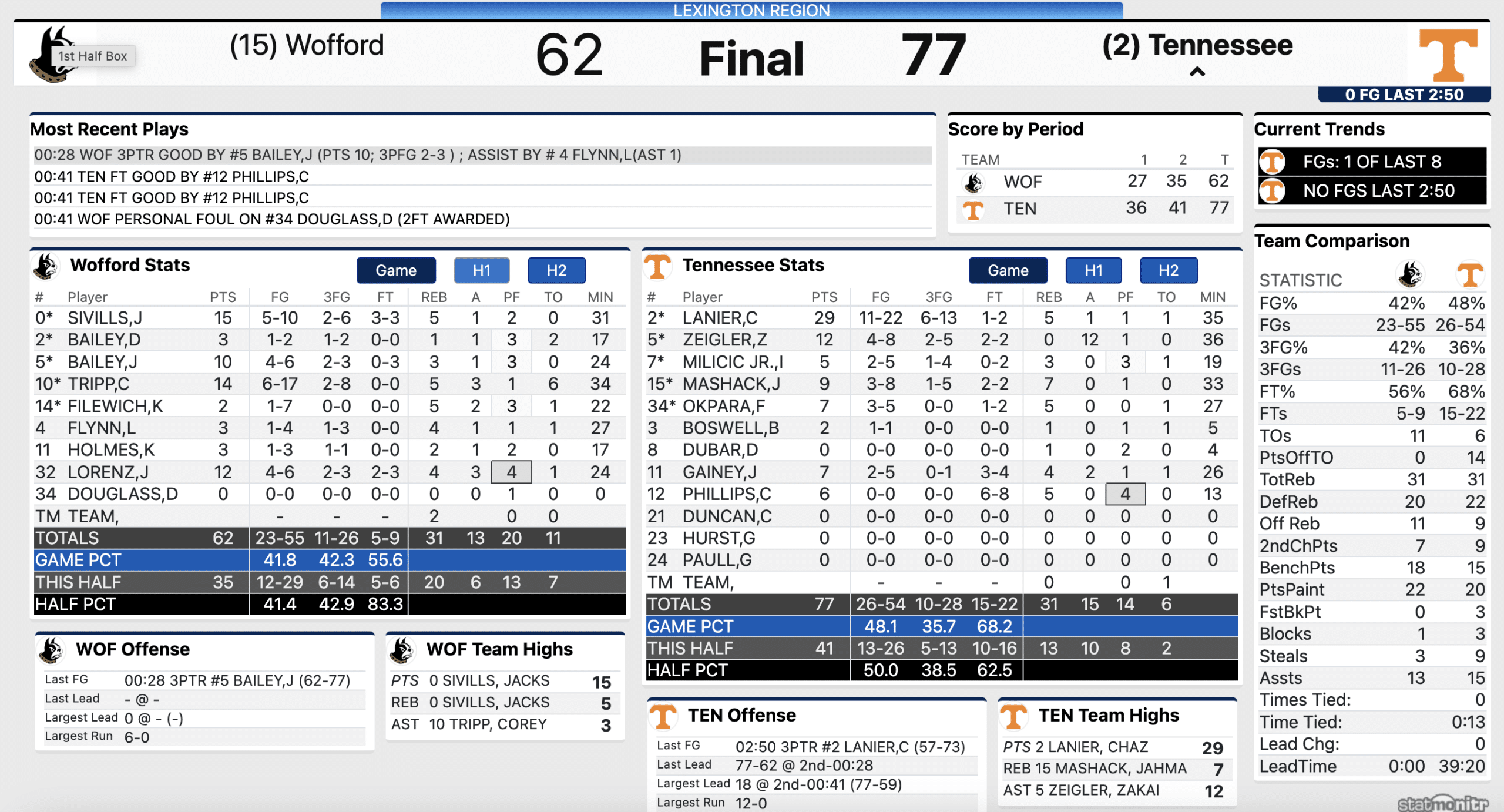 The run occurred over a 3:53 stretch of time where Wofford missed a trio of three-pointers and turned the ball over once. Tennessee took a 14-point lead following the run and that gave them some good cushion.