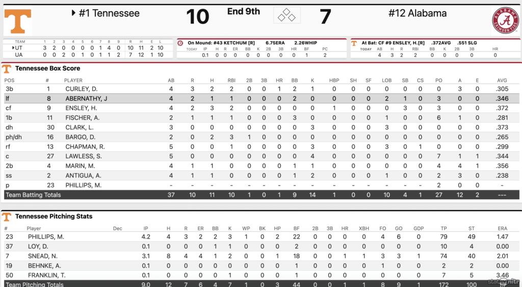 Tennessee and Alabama conclude their weekend series on Saturday afternoon in Tuscaloosa. First pitch is at 2 p.m. ET and the SEC Network+ is streaming the game.