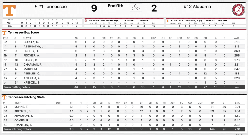 Krenzel hadn’t pitched in Tennessee’s first five SEC games this season but made the post of his opportunities on Saturday. After getting out of the fifth inning jam, Krenzel stayed in the game and almost went the distance for Tennessee. The Crimson Tide finally got on the board against Krenzel in the eighth inning after he worked scoreless sixth and seventh innings.