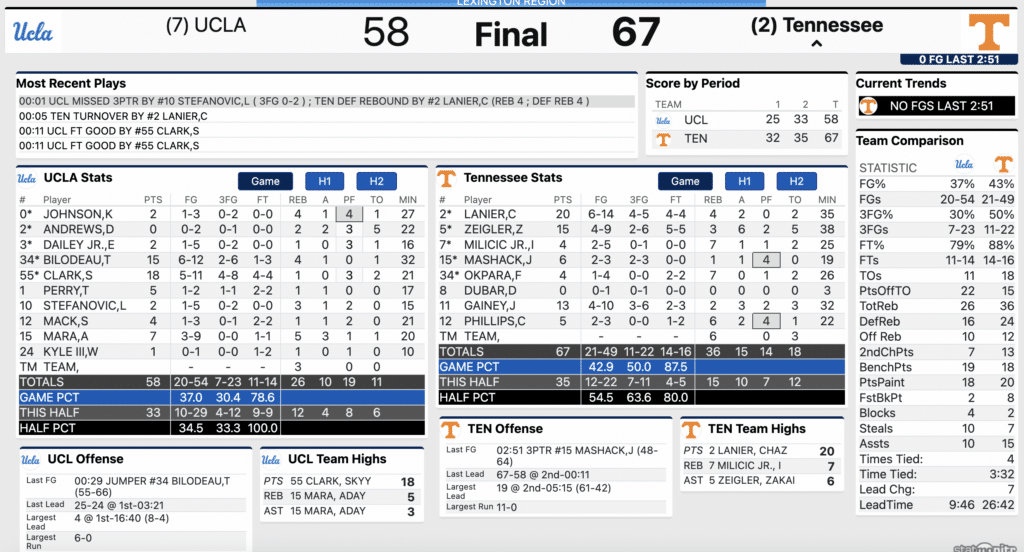 UCLA had led for the vast majority of the first half and held a two-point lead with four minutes to play in the first half. That’s when Tennessee’s defense took it up to overdrive. The Vols held UCLA to just two points in the final stretch of the first half and found a way to get some huge buckets.