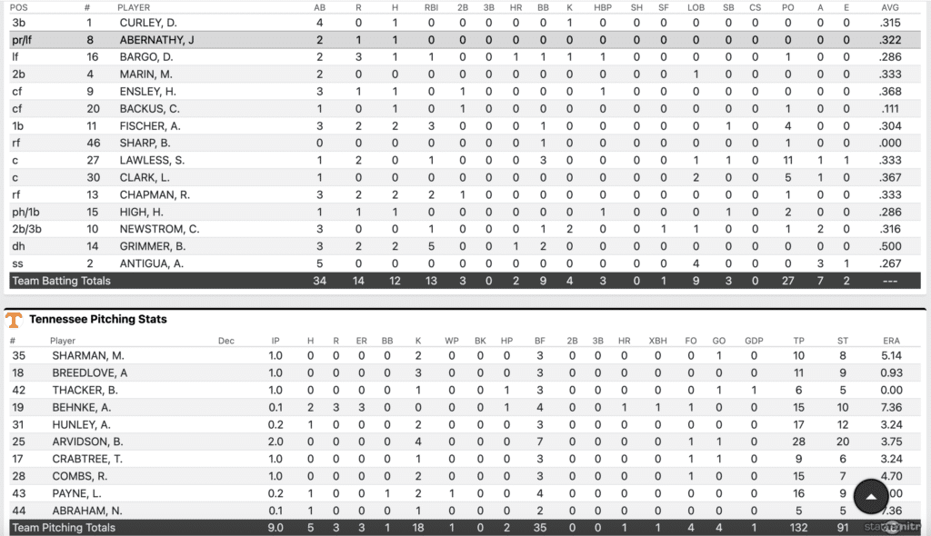 Tennessee did its usual midweek pitching plan of throwing a number of pitchers in “Johnny Wholestaff” game. We touched on the rough outing for Andrew Behnke and to a much lesser extent Austin Hunley.