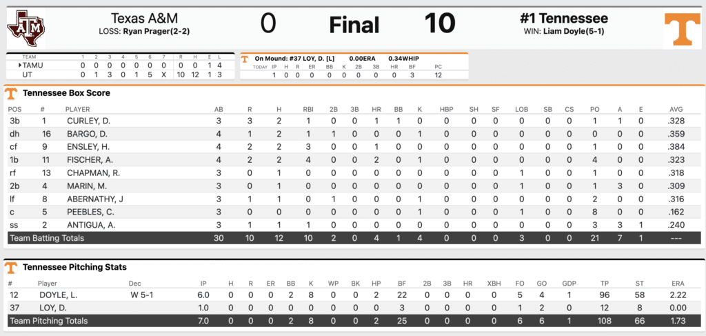 Here’s how Doyle and Loy got it done on the mound and the Vols’ got it done at the plate to rout Texas A&M to open the weekend series.