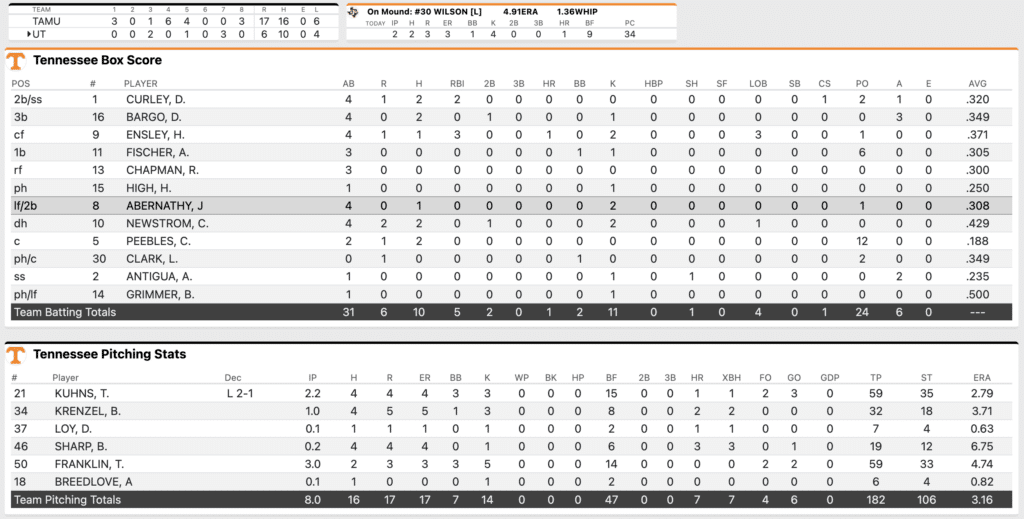 Vols starter Tegan Kuhns opened the game well enough, retiring the first two batters he faced before Wyatt Hanseler singled to center field and then a softly hit Caden Sorrell grounder found a hole in the defense to give the Aggies two-on with two-outs. Then Bear Harrison stayed hot and gave Texas A&M an early lead with a three-run homer to left field.