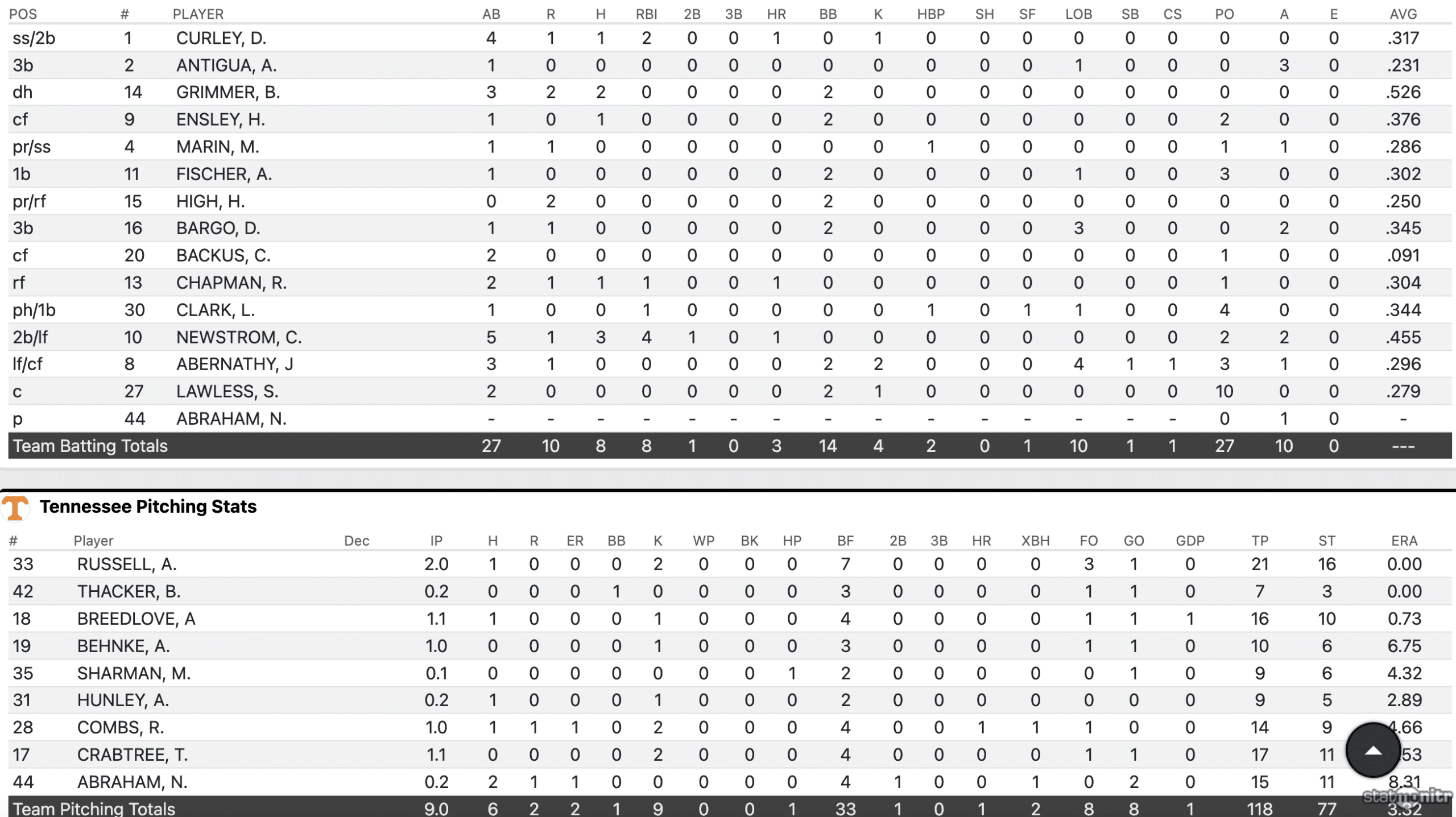 Newstrom started for Tennessee again on Tuesday night, this time at second base, and stayed hot. He hit the previously mentioned solo home run, drove in two more runs that inning with a two-out RBI double in the right-center gap and had a RBI infield single in his final at-bat.
