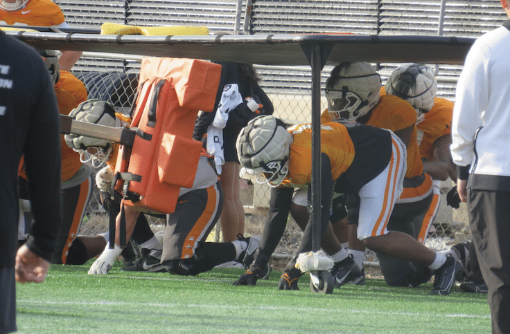 Tennessee’s defensive linemen did its usual two drills with four players exploding off the line of scrimmage and then them running around the edge and knocking the ball away from a dummy quarterback. The Vols have added a new element to the later drill, having the linemen swipe away a pad from a coach right when they got off the line.