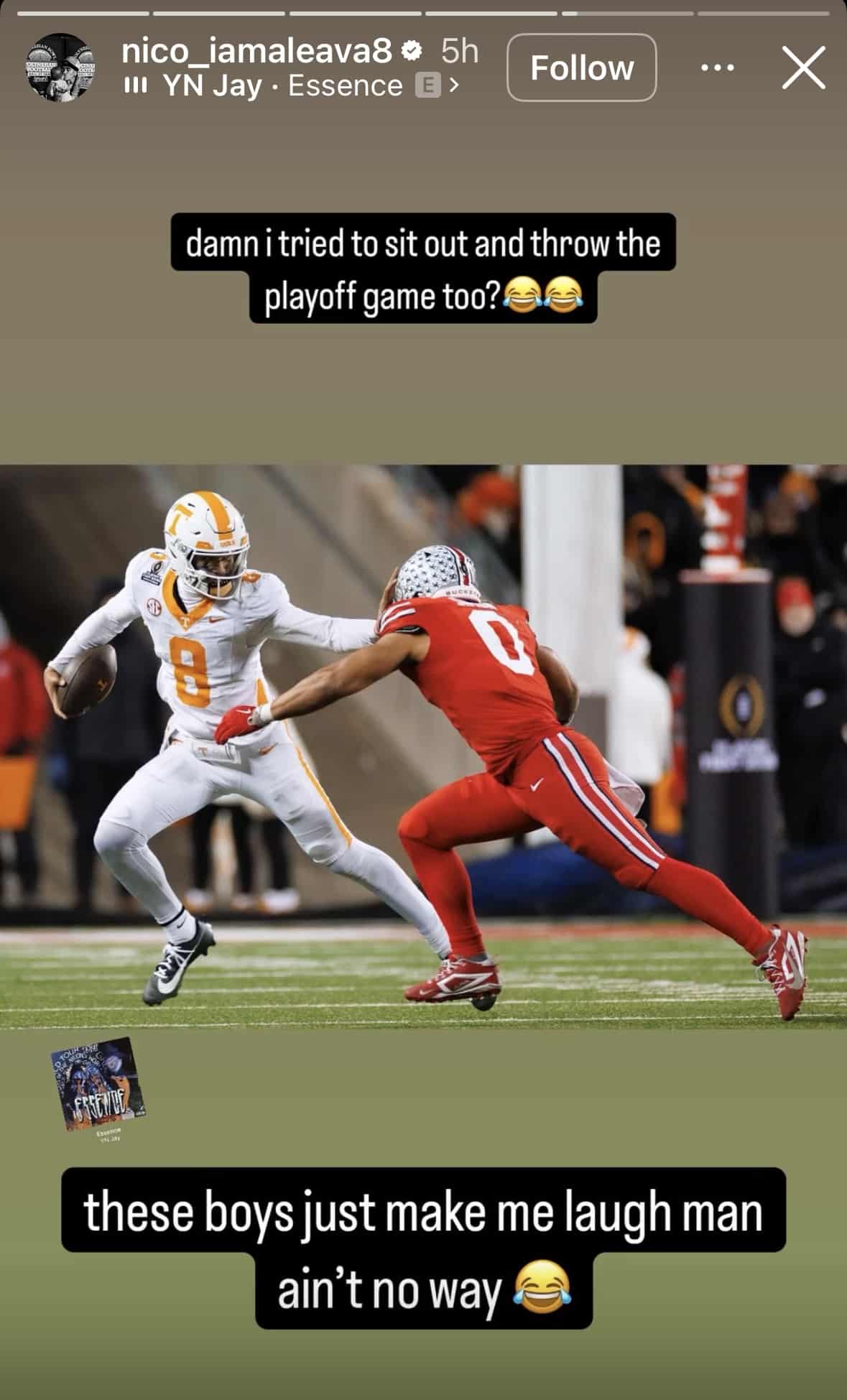 The first captioned picture was of Iamaleava running the ball against Ohio State in the playoffs last season, with laughing emojis and the caption, “Damn I tried to sit out and throw the playoff game too? These boys just make me laugh man ain’t no way.”