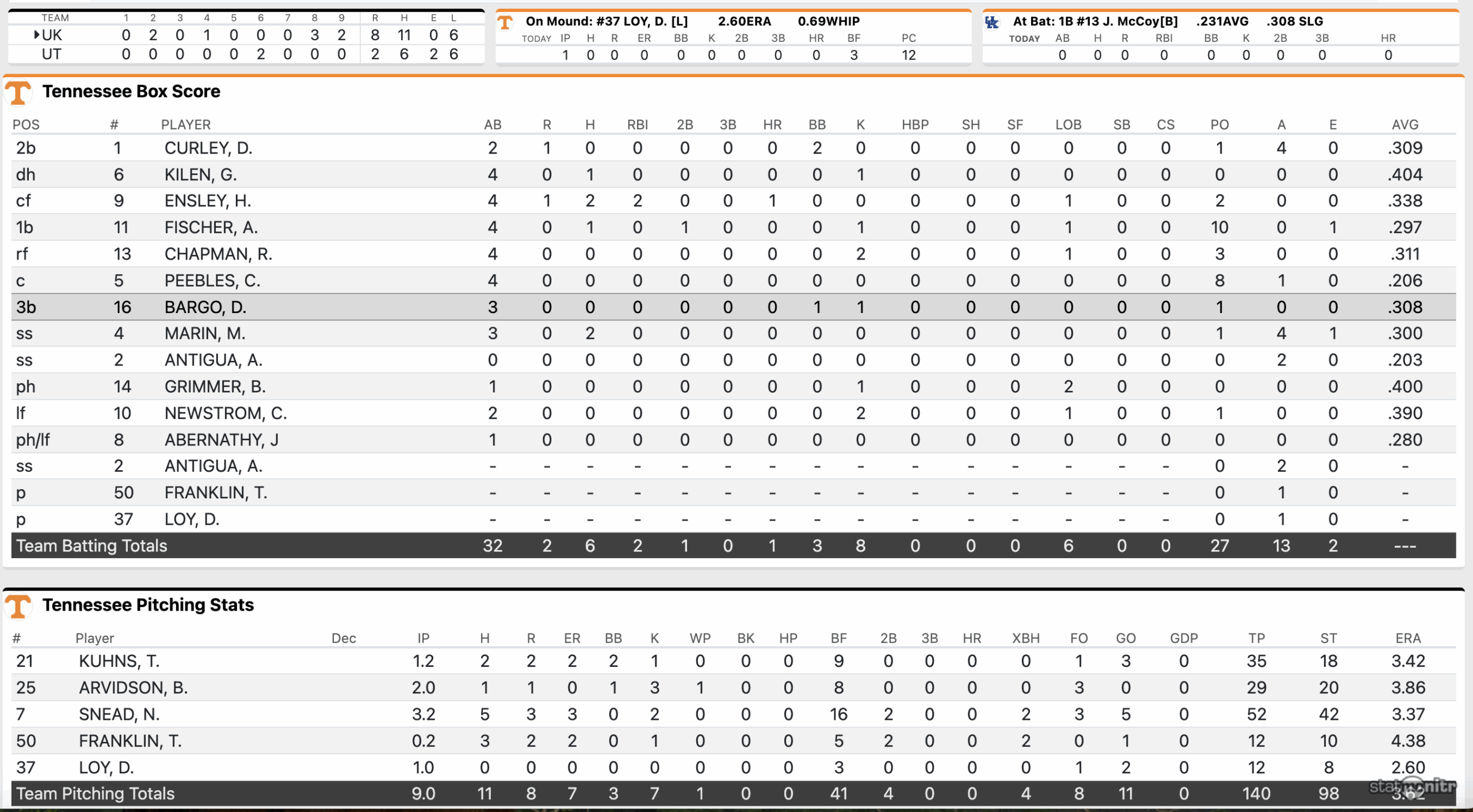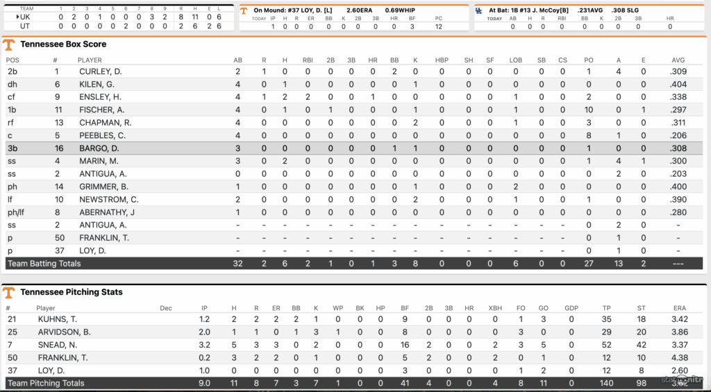 Tennessee was able to stay in the game thanks to Ensley’s two-run homer but more importantly five really strong innings of relief from Brandon Arvidson and Nate Snead.