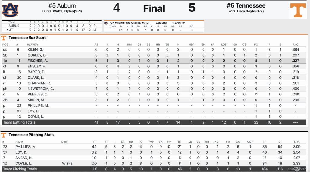 Auburn’s Irish reached with one out on a Dean Curley throwing error. He was originally ruled out stealing second but the review overturned it. That led to a pitching change and Dylan Loy relieving Marcus Phillips. Tennessee had Irish dead to rights stealing third with two outs, but Manny Marin slipped while covering the base. Irish came home to score shortly afterward when a Loy wild pitch got away from Cannon Peebles.