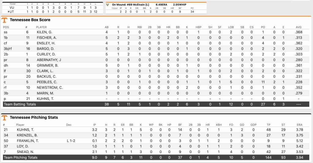 In the ninth, Tennessee put two-on with one-out thanks to hits from Ensley and Curley. Blake Grimmer flew out to the warning track in center before Levi Clark walked to load the bases. Cannon Peebles struck out on three pitches to end the game. Tennessee left 12 runners on base to just three from Vanderbilt