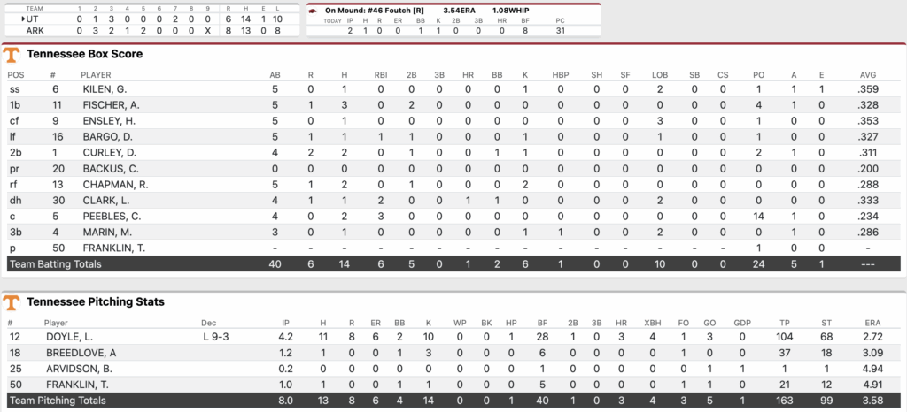 Doyle did a good job of pitching into the fifth inning and would have gotten through the fifth inning if it weren’t for a two-out throwing error. Tennessee’s ace allowed eight runs and six earned runs on 11 hits in 4.2 innings pitched. Doyle did strikeout 10 batters while walking two.