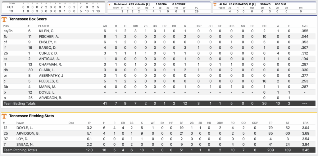 The Vols looked poised to steal a win late from Texas before things went sideways. Ryan Galvan led off the inning with a single up the middle. Arvidson got ahead of Kimble Schuessler 0-2 before sailing a pick off attempt to first base, allowing Galvan to go from first to third. Schuessler drove him in and ended Arvidson’s day with a single to left field.