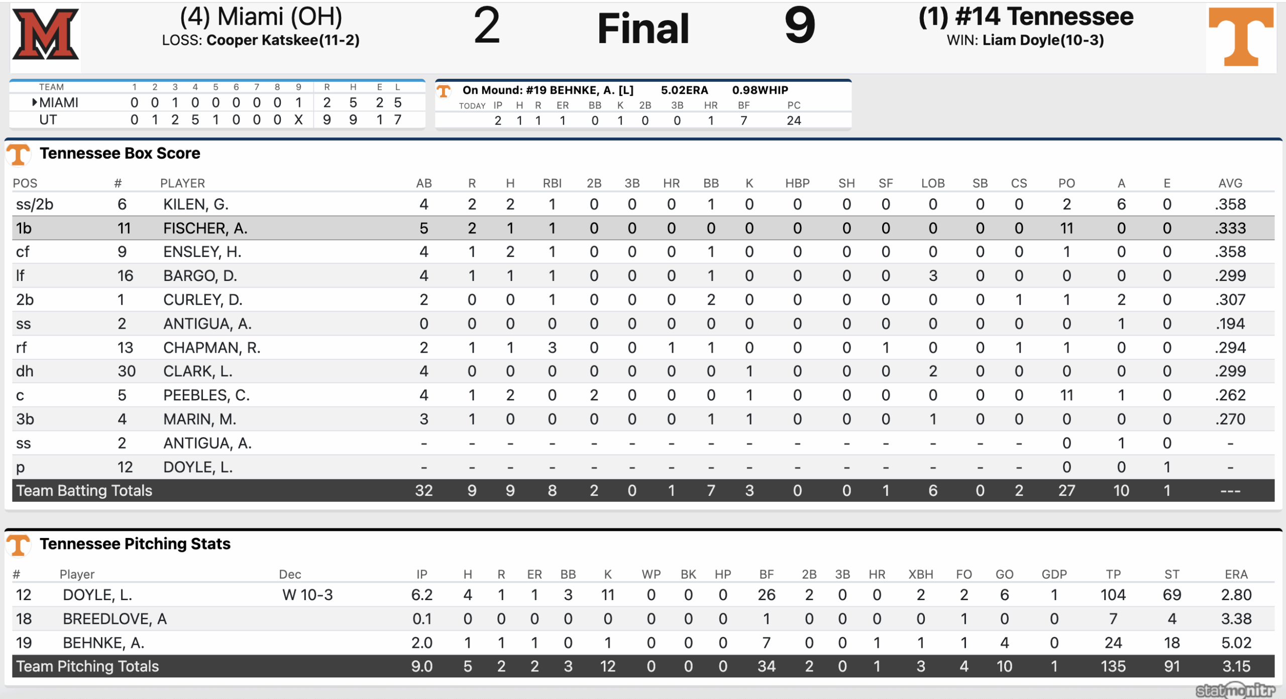 Levi Clark was the only person in Tennessee’s lineup not to reach base and he hit the ball hard multiple at-bats. Six Tennessee batters reached base multiple times including Gavin Kilen and Hunter Ensley who each reached base three times. Six different Vols drove in runs with Reese Chapman leading the way with three RBIs.