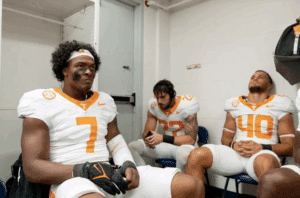 Here’s a look at a picture from Tennessee Athletics with three UT linebackers getting prepared for a game at Florida during the 2023 season.