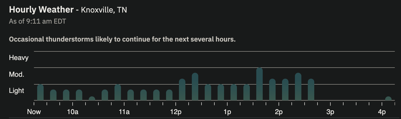 At the time of this publication (9:00 a.m. ET), The Weather Channel is predicting a day full of thunderstorms and rain in Knoxville.