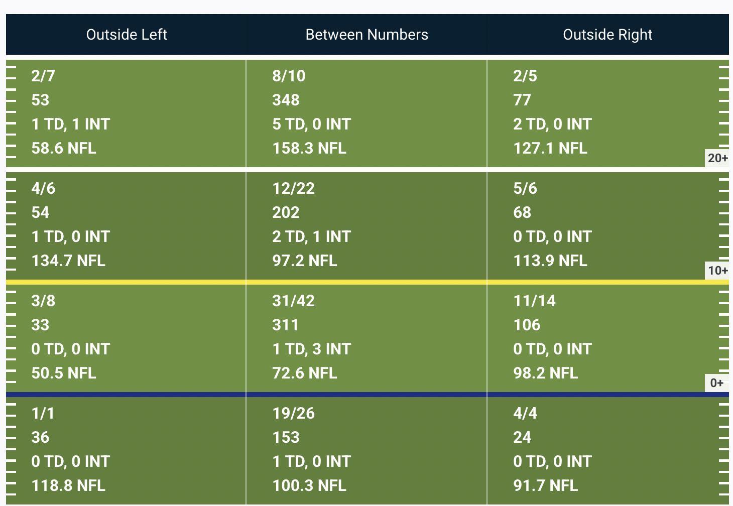 Overall, Aguilar has been really good on throws between the numbers. The one issue there has been interceptions. He’s throw four of his five interceptions between the numbers with three of his five interceptions coming on passes less than 10 yards between the numbers.