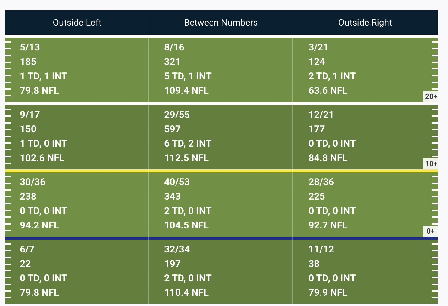 He’s been less accurate on deep throws outside of the numbers, completing two-of-seven passes on the left side and two-of-five passes to the right side. But those throws have accounted for 130 yards, three touchdowns and just one interception. And the one interceptions was effectively a third down arm punt late in the first half against Georgia.