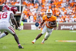 DeSean Bishop (18) rushes the ball against Arkansas at Neyland Stadium, Saturday, Oct. 11, 2025. Cole Moore/RTI