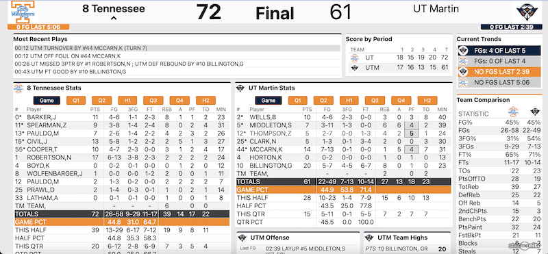 On Sunday, they had to win a war of attrition with UT Martin on the road to avoid an upset, claiming victory by a score of just 72-61.