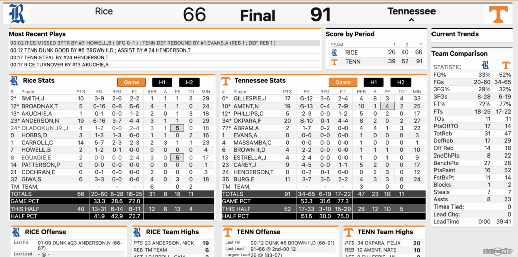 The Vols entered the game rebounding 53.1% of their misses, a mark that ranked first nationally. They rebounded 58% of their misses against Rice.