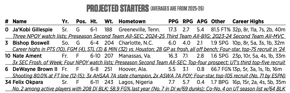Assists: Ja’Kobi Gillespie — 5.4 APG, 2.7 TOPG, 32.1 MPG